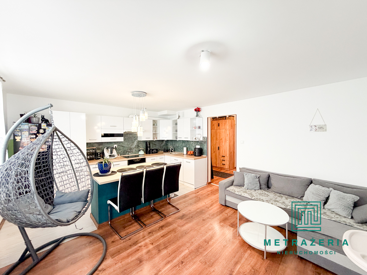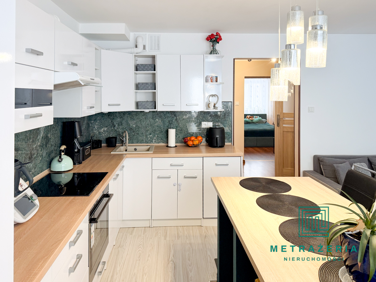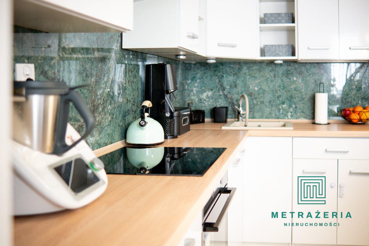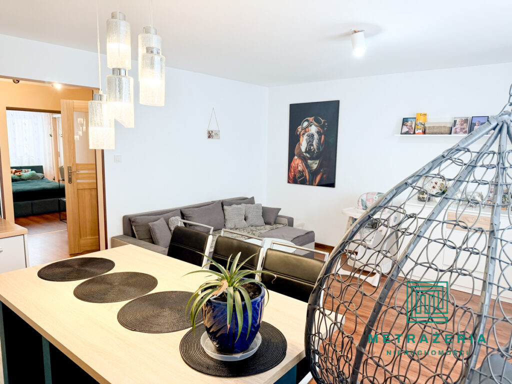 Układ jest funkcjonalny i praktyczny. Część dzienna to salon z aneksem kuchennym oraz wyjściem na balkon. W 2024 roku w kuchni wykonano nowe płytki oraz zamontowano nowy blat, co nadało wnętrzu świeżości i nowoczesnego charakteru.