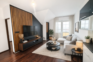 Na zdjęciu widoczna jest symulacja umeblowania salonu.
