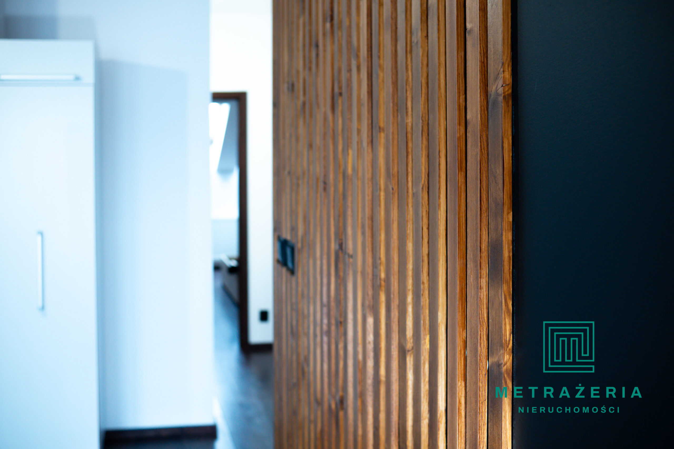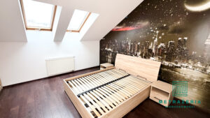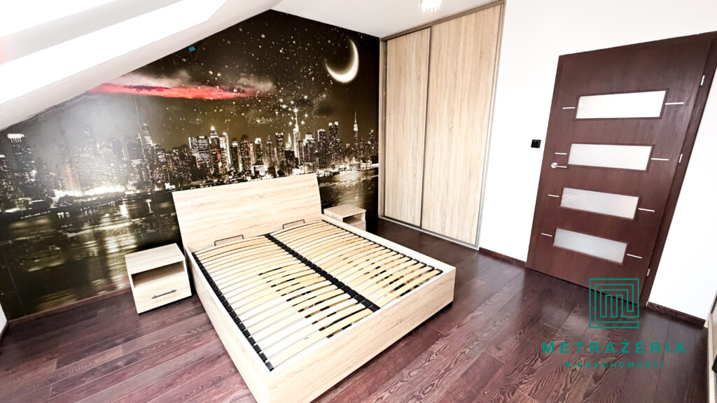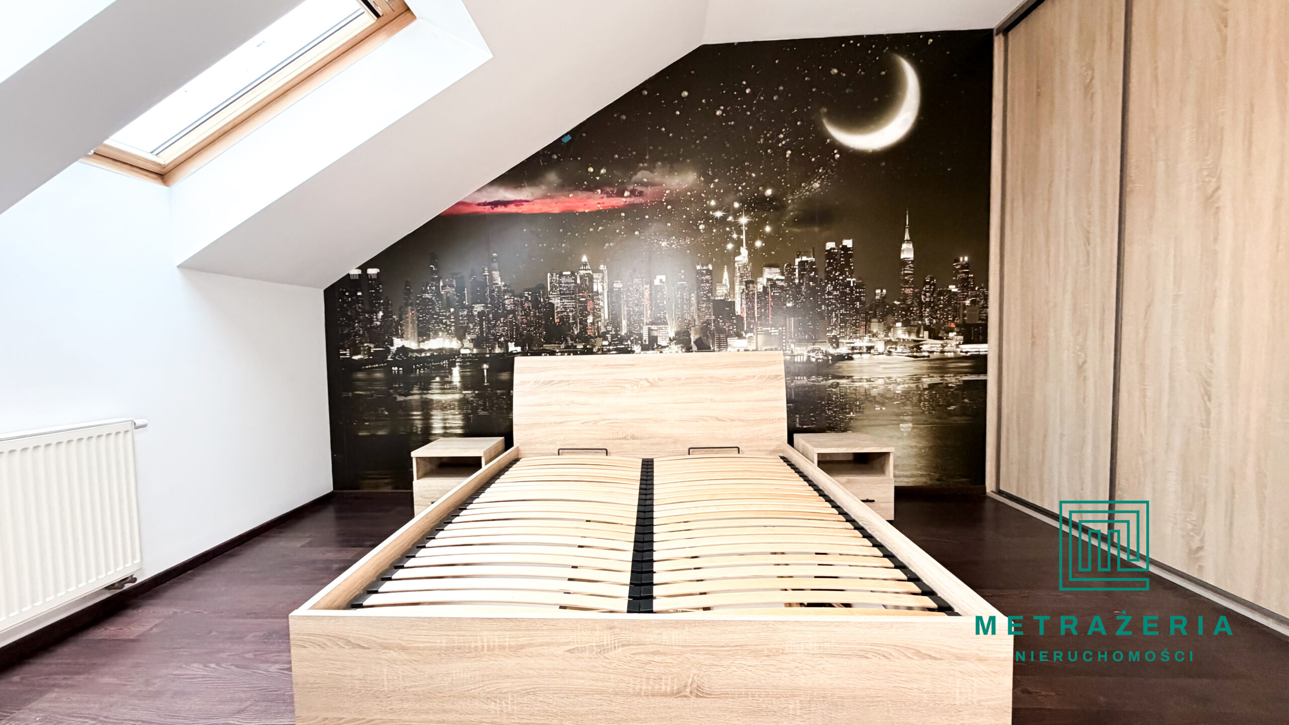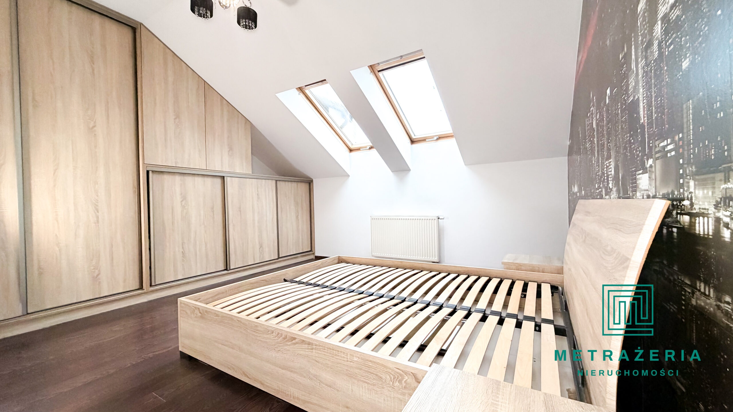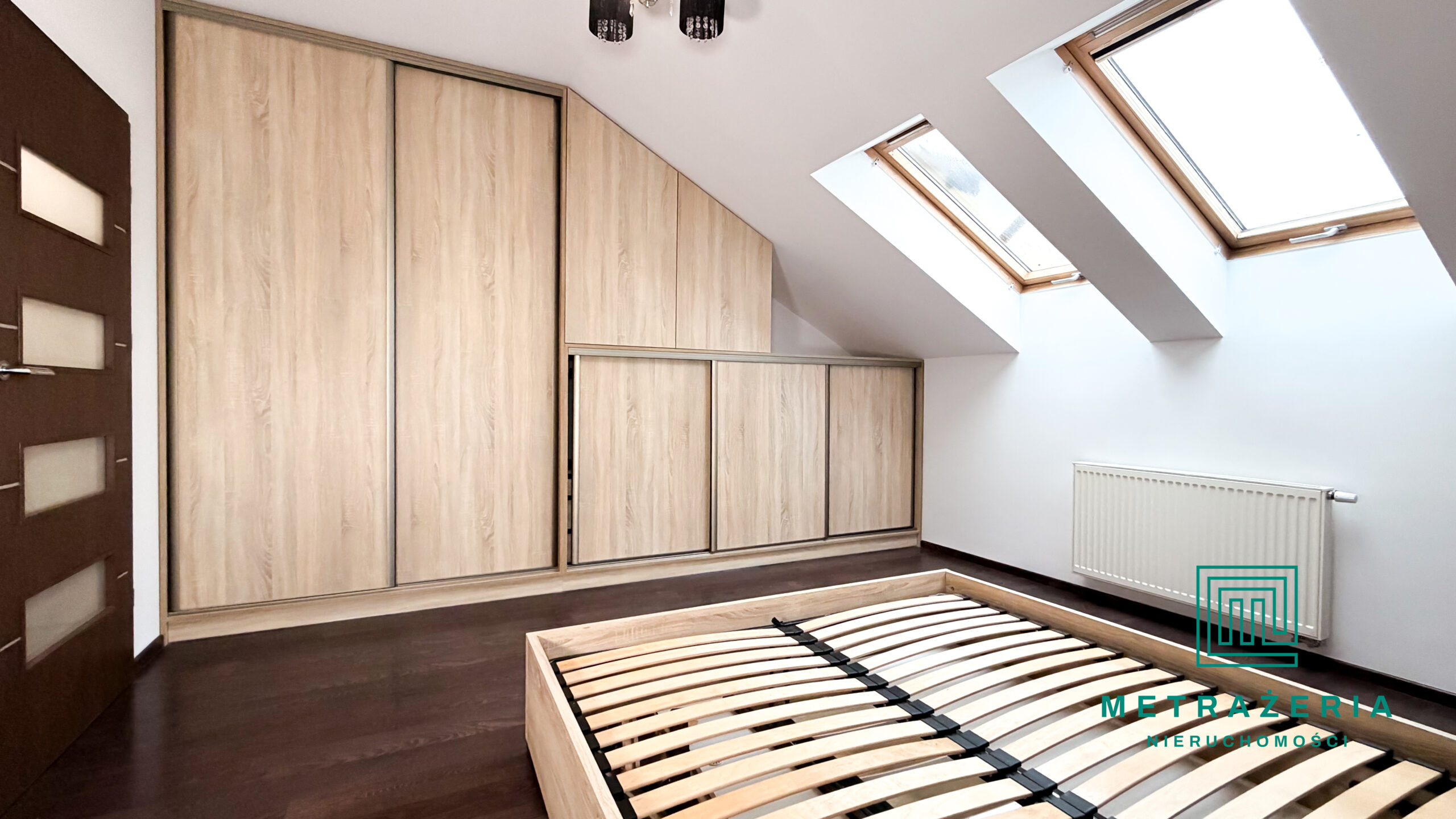 Strefa prywatna obejmuje dwie sypialnie z oknami połaciowymi. Większa z nich jest w pełni umeblowana – z dużymi szafami w zabudowie, łóżkiem i szafkami nocnymi. Druga, mniejsza, sprawdzi się jako pokój dziecięcy, gabinet lub sypialnia gościnna.