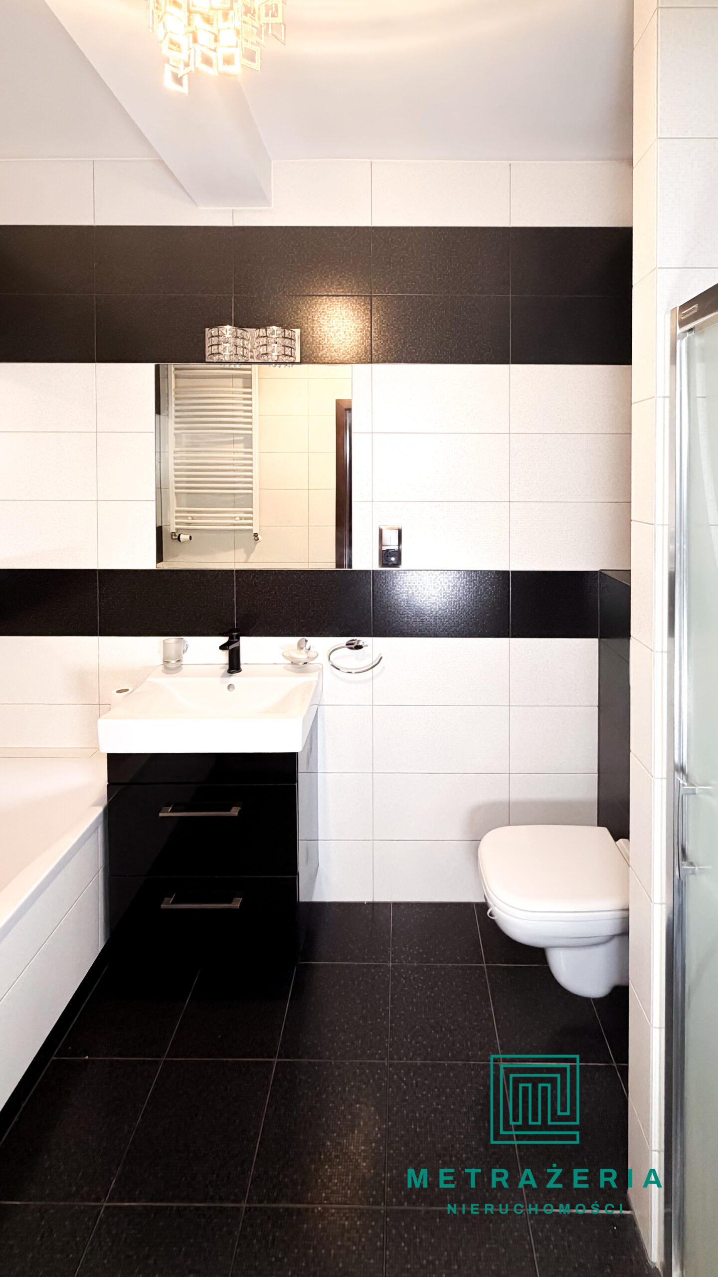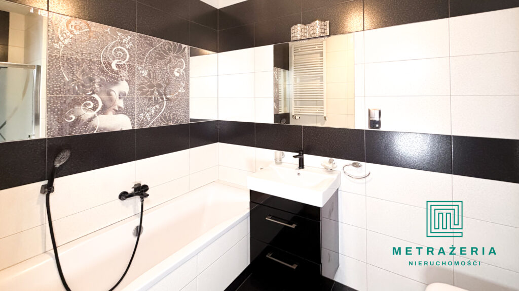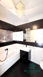 Łazienka została zaprojektowana uniwersalnie– znajduje się tu zarówno wanna, jak i prysznic. Całość uzupełnia przedpokój.